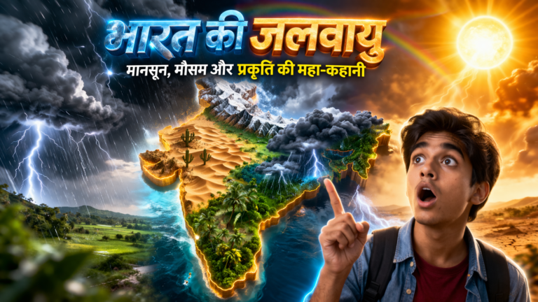 भारत की जलवायु – एक अद्भुत और विस्तृत यात्रा भारत की जलवायु: मानसून, मौसम और प्रकृति की महा-कहानी (Climate of India) “भारत दुनिया का इकलौता ऐसा देश है जहाँ एक ही समय में, अगर आप कश्मीर में हैं तो बर्फ…