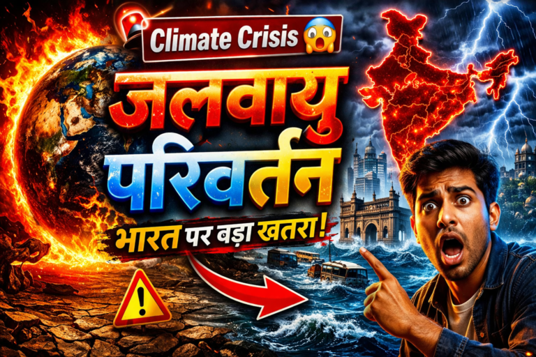 जलवायु परिवर्तन और भारत – एक विस्तृत और संपूर्ण विश्लेषण जलवायु परिवर्तन और भारत: एक गहरा संकट, प्रभाव और हमारी ज़िम्मेदारी (Climate Change & India) “कुछ साल पहले तक ‘जलवायु परिवर्तन’ (Climate Change) सिर्फ स्कूल की किताबों, वैज्ञानिकों की बैठकों…